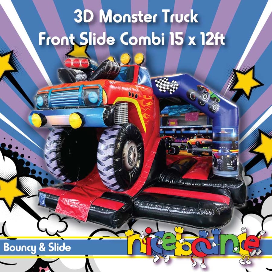 Rev up the excitement at your event with the Monster Truck (3D) Front Slide Combi 15ft x 12ft. Ready to take your guests on a thrilling ride into a world where monster trucks reign supreme, adventure is around every corner, and bouncing fun knows no bounds? Nice Bounce’s Monster Truck Bouncer is your ticket to an action-packed journey filled with energy and exhilaration.