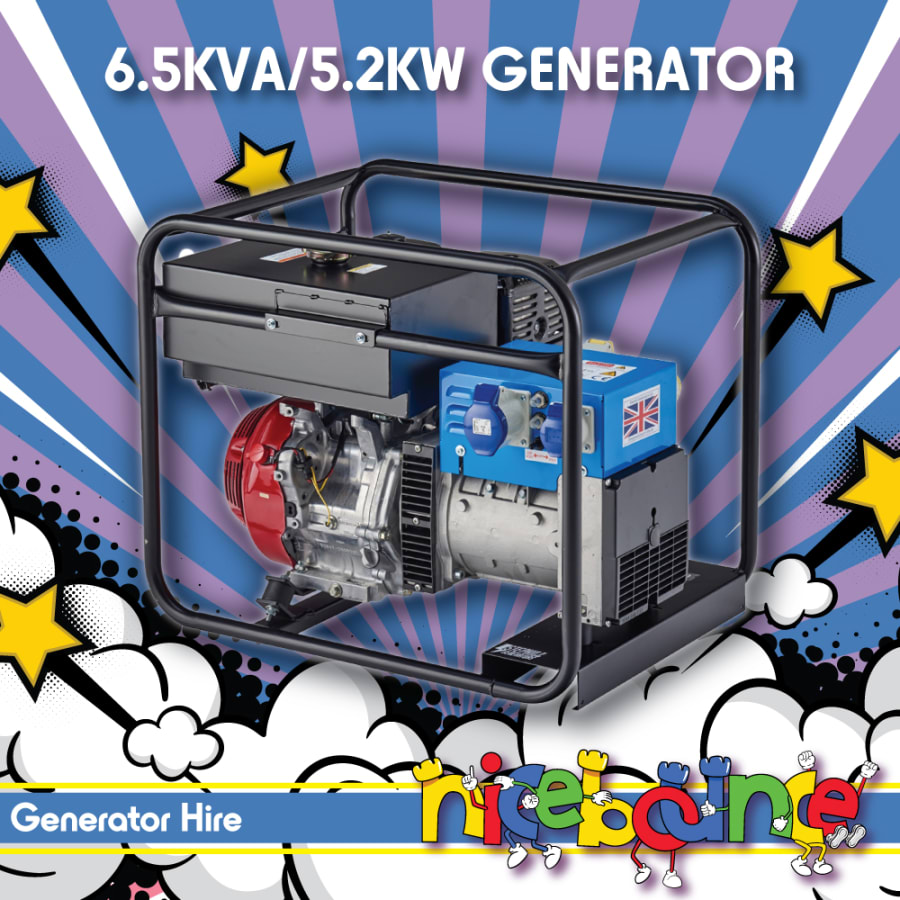 Don't let power issues spoil your event. Contact Nicebounce today to rent the Stephill 6.5KVA/5.2KW Generator HON/NSM with Long Run Tank and make sure your event is a success. The generator will always come with a full tank of unleaded fuel, ONLY top up the fuel if required with Unleaded Fuel