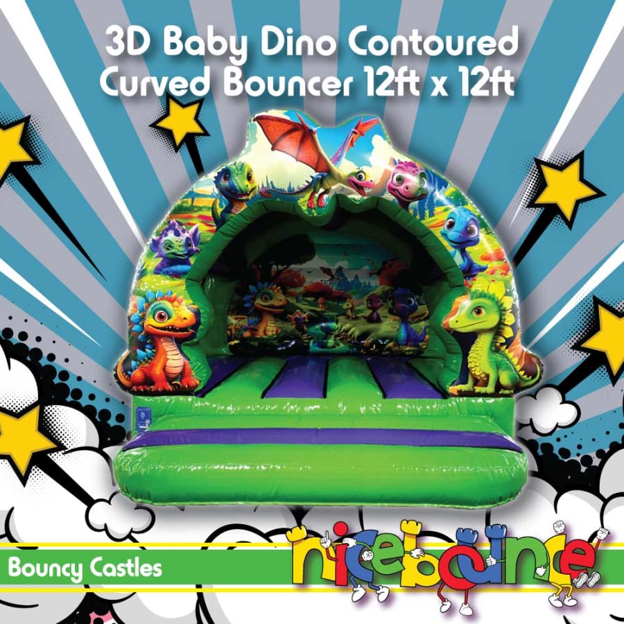 Lift your event to a realm of playful wonder and joy with the 3D Baby Dino Contoured Curved Bouncer 12ft x 12ft. Are you ready to whisk your guests away to a delightful land where baby dinosaurs frolic, colours burst with vibrancy, and bouncing fun never ends? Look no further than Nice Bounce’s Baby Dino Bouncer, your ticket to a whimsical adventure that's bursting with cuteness and excitement.
