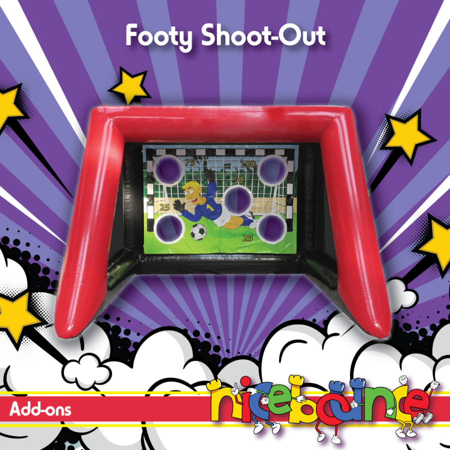 Experience a field of fun with the Footy Shoot-Out – an inflatable football extravaganza that will test your skills and ignite your competitive spirit! This dynamic game is perfect for football enthusiasts of all ages, featuring five targets to aim your shots at. Dressed in vibrant shades of blue and red, adorned with graphics of a football player in action, the Footy Shoot-Out is a visual delight that promises hours of exhilarating entertainment.